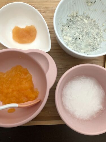 こんにちは。 つくしと申します♪ つくしんぼの食事42日目。 午前は… 5倍粥。 じゃがいも、玉ねぎ、牛赤身肉のペースト。 かぼちゃとさつまいも。 お肉のペーストは本日乗り気ではなく、一口でベェー。他はほぼ完食しました そして午後。 オートミールにかぼ…